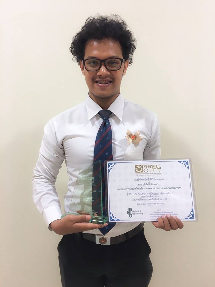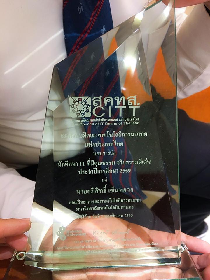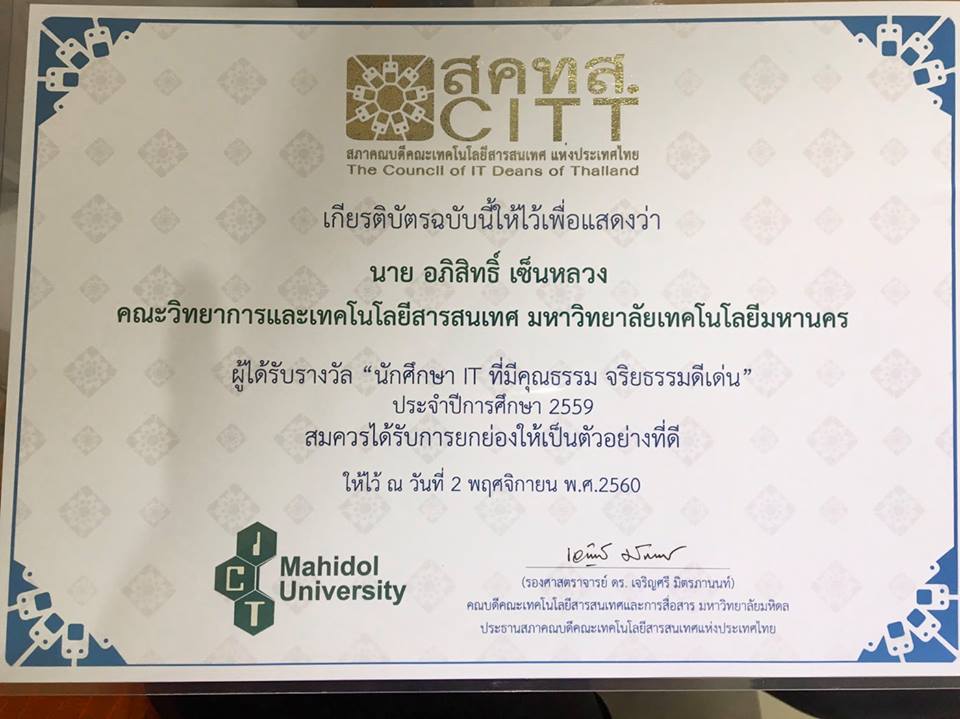 ขอแสดงความยินดีกับ นายอภิสิทธิ์ เซ็นหลวง นักศึกษาคณะไอเอสที ที่ได้รับรางวัล CITT of student 2017 (นักศึกษาคุณธรรม จริยธรรมดีเด่น) จากสภาคณบดีคณะเทคโนโลยีสารสนเทศแห่งประเทศไทย
