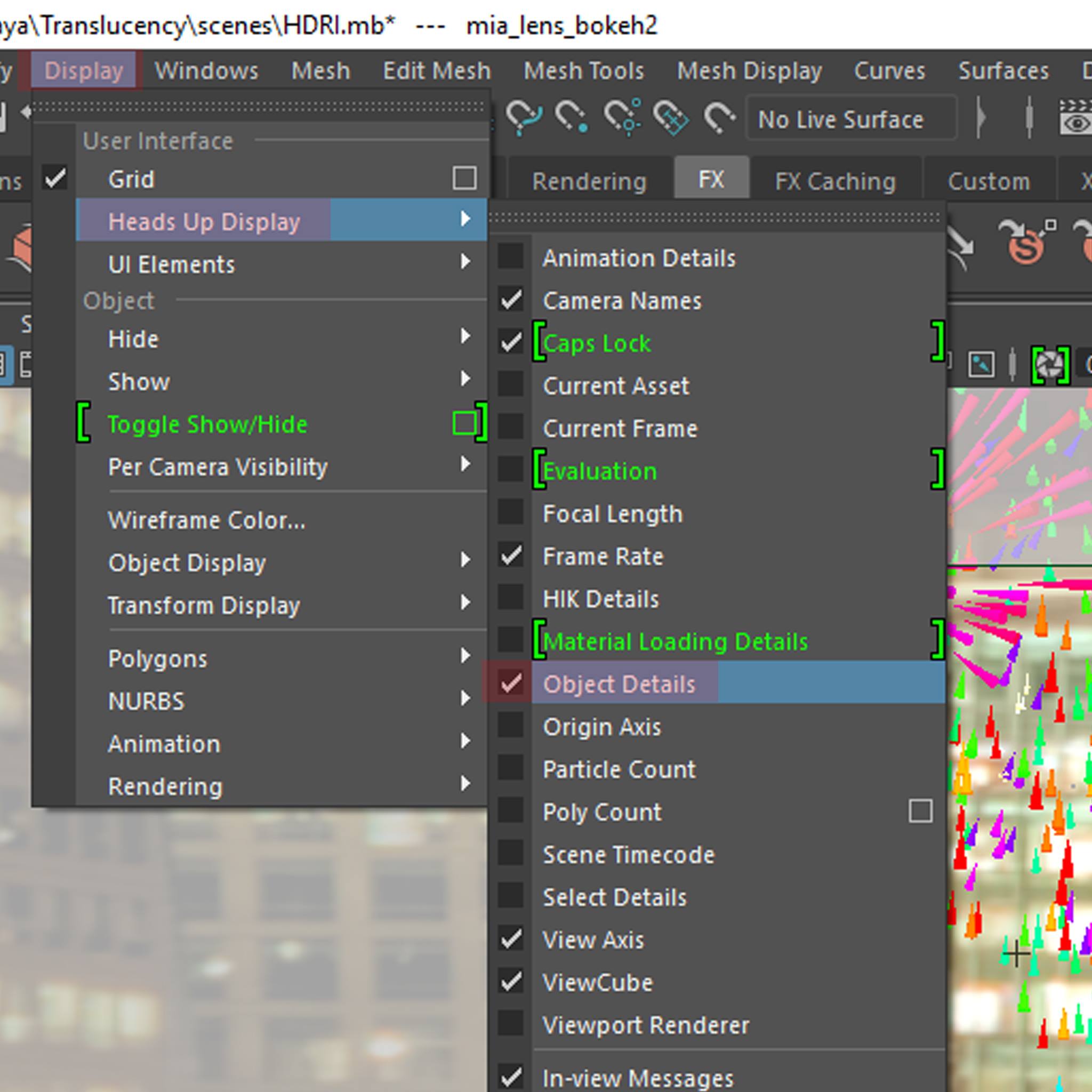 จากนั้นทำการเปิด Object Detail เพื่อดูข้อมูลของ Object ที่เรากำลังเลือกอยู่ ไปที่ Display > Heads Up Display > Object Detail