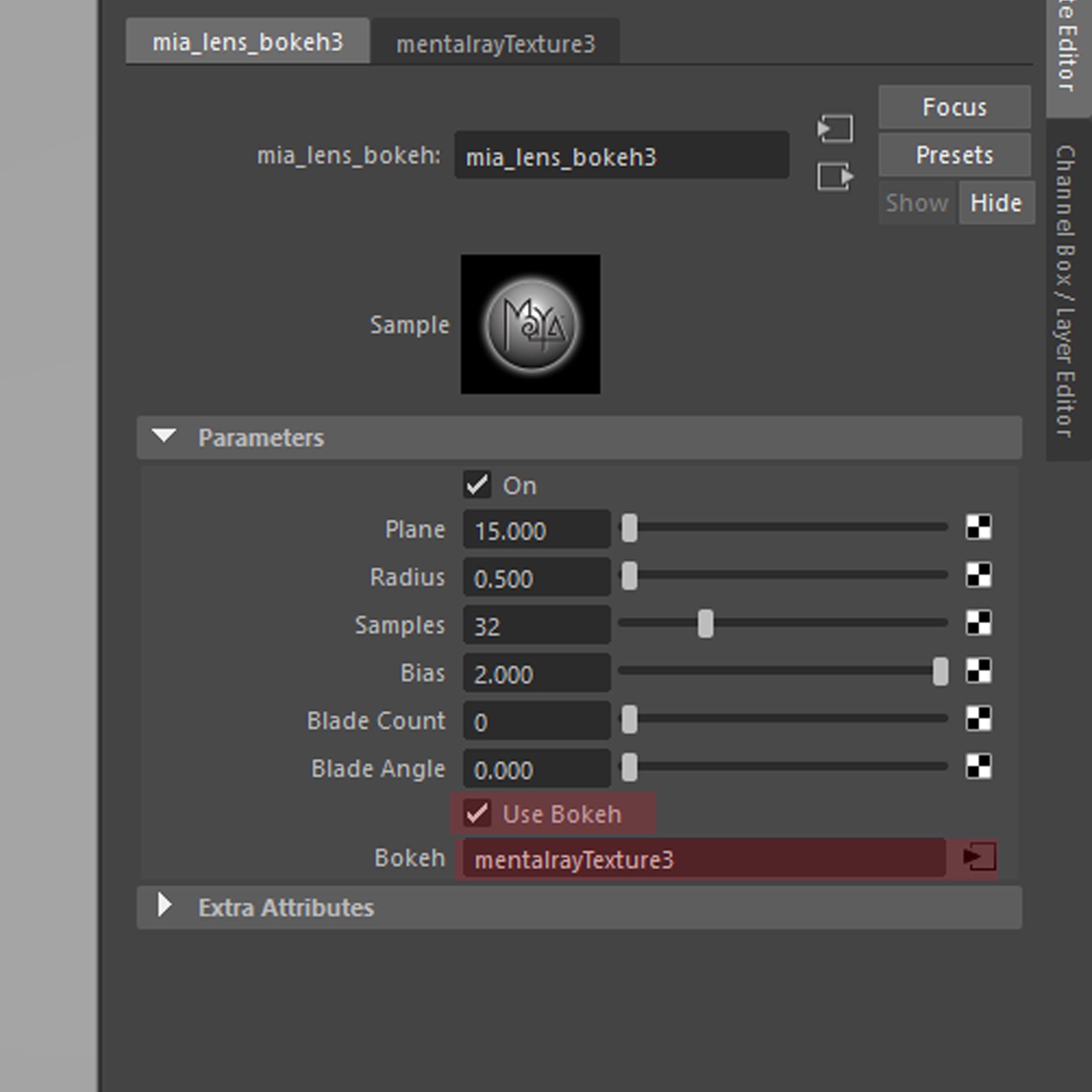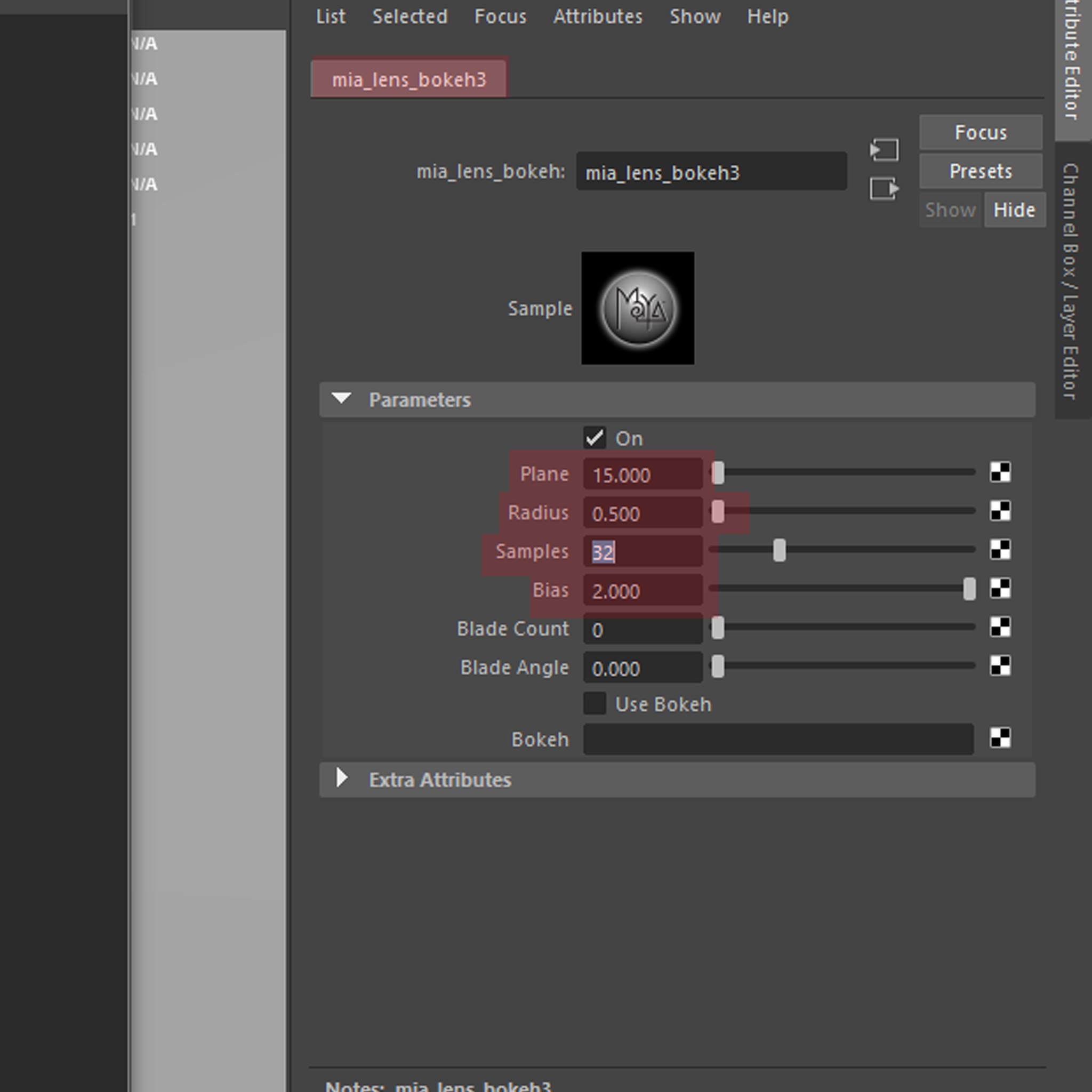 ทำการปรับค่าของ mia_lens_bokeh โดยกำหนดระยะโฟกัส และค่าต่าง ๆ ตามความเหมาะสม โดยค่า Plane คือค่าของระยะห่างระหว่างกล้องกับจุดโฟกัสที่เราต้องการให้มีความชัดของภาพ