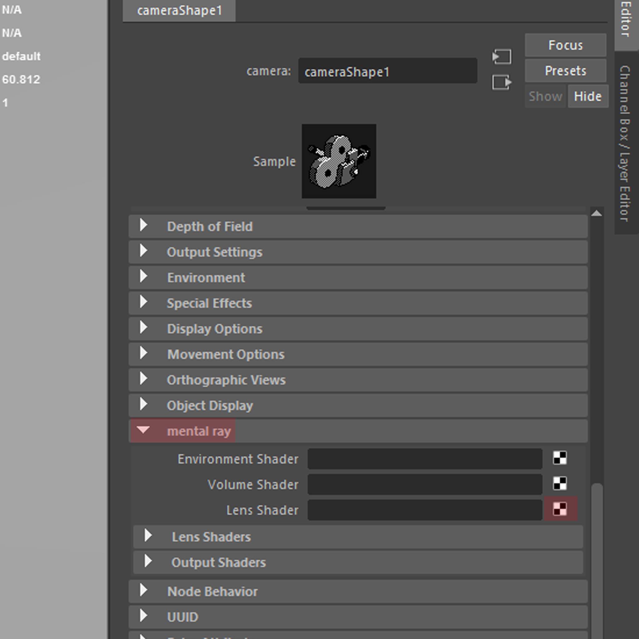 ทำการเพิ่ม Shader Effect ให้กับตัวกล้องโดยเข้าไปปรับแต่ง Attribute ของตัวกล้อง ในส่วนของ Mental Ray > Lens Shader