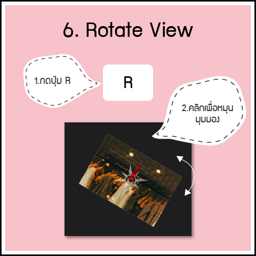6. หากเราทำงานประเภทการรีทัชแล้วรู้สึกว่ามุมมองไม่สะดวกสำหรับการทำงาน..สามารถ Rotate มุมมองได้แค่กด R แล้วหมุน
