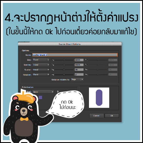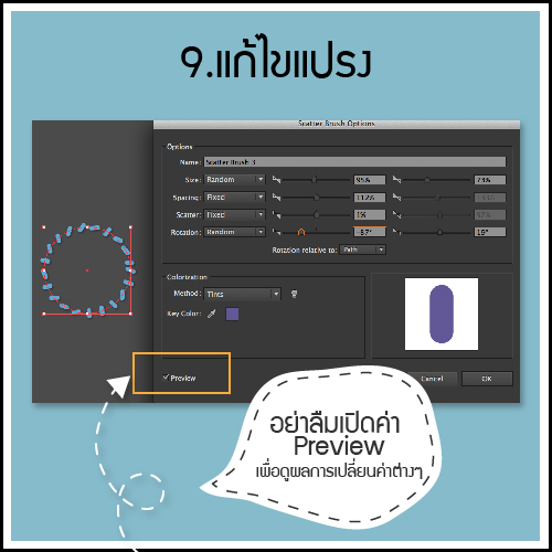 มาถึงตรงนี้ให้คลิกเลือกเส้นที่ใส่ค่า Scatter Brush ก่อนที่จะเข้ามาแก้ไขนะ.....จากนั้นเข้าไปแก้ไขโดยเปิดค่า Preview เพื่อจะได้เห็นความเปลี่ยนแปลงเมื่อเราเปลี่ยนค่าต่างๆให้กับแปรง